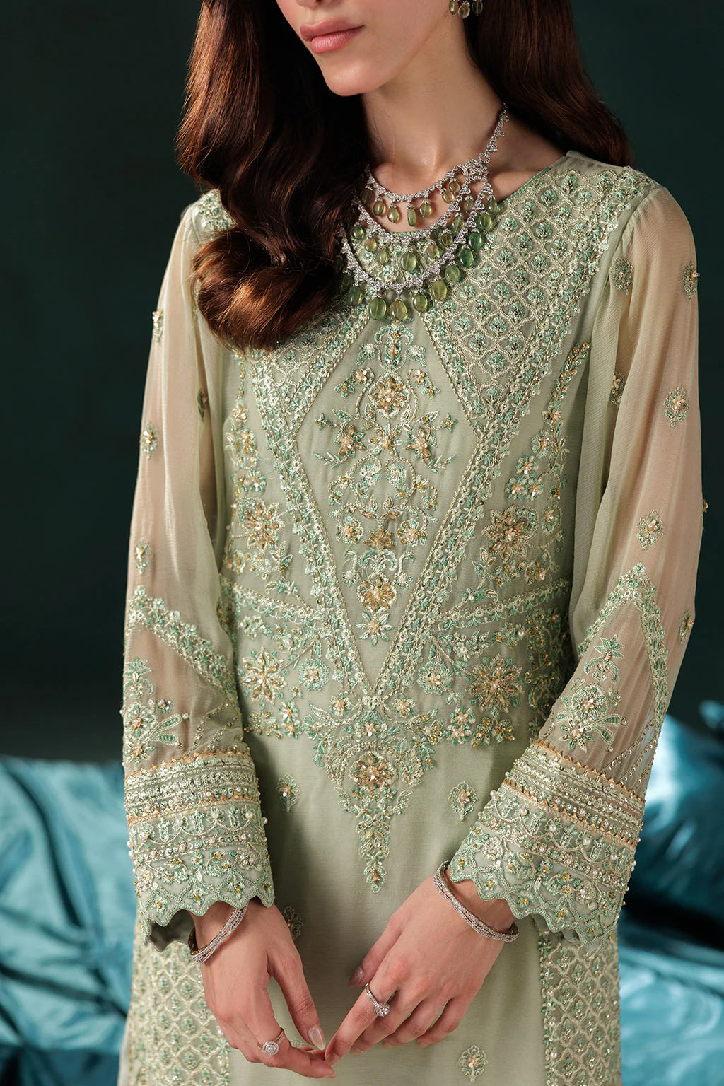 - Embroidered hand embellished sleeves border on organza