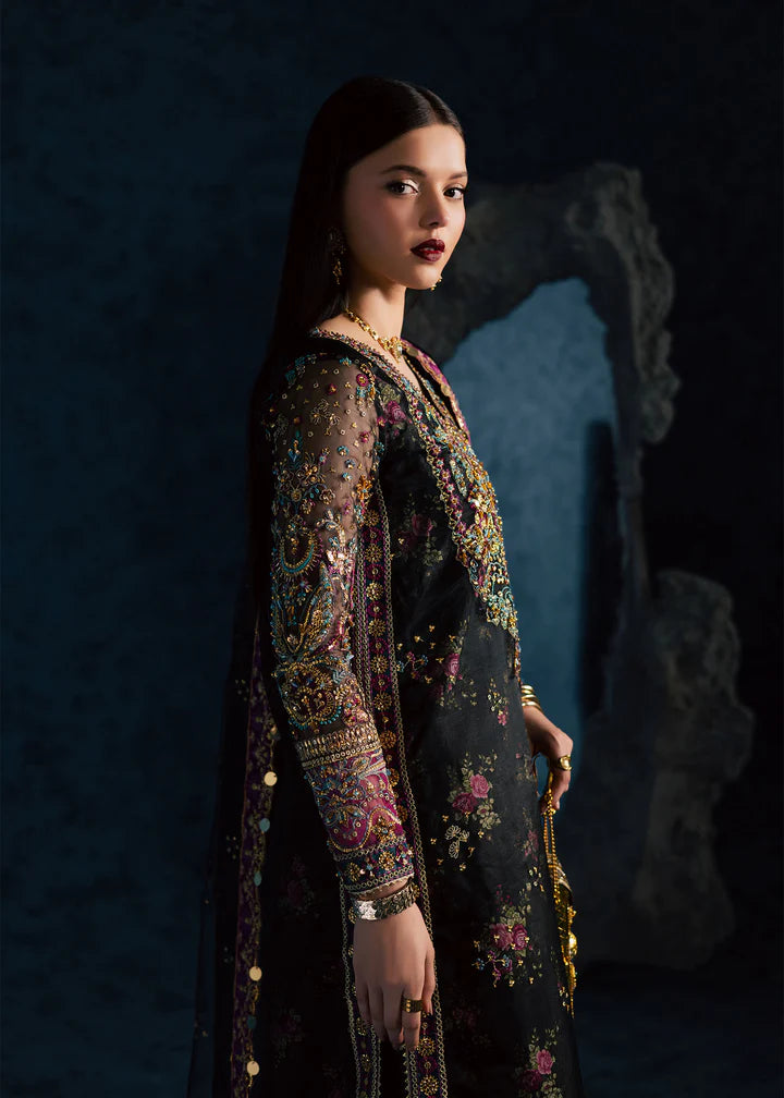 Featuring an embroidered and hand-embellished neckline, front, and sleeves on organza, paired with a printed Indian raw silk inner and trouser . The look is completed with a heavily embroidered dupatta and ornate borders that capture regal artistry in every thread.