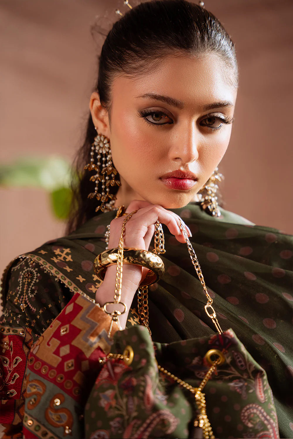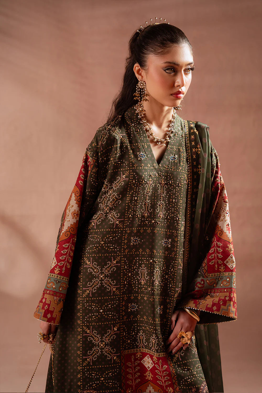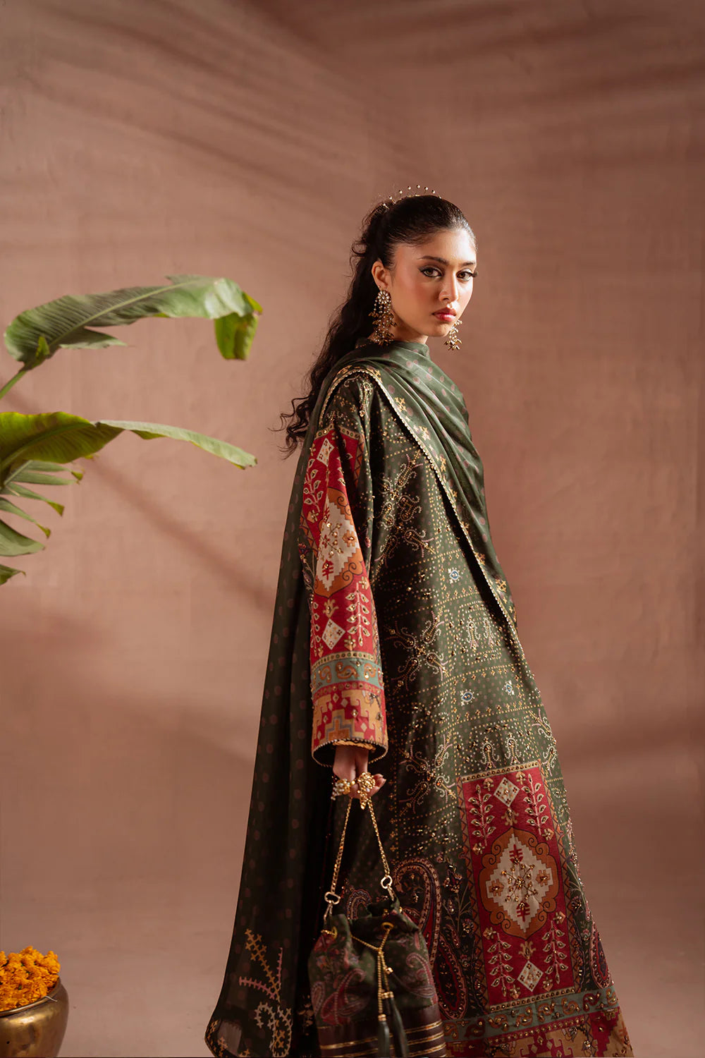 DESCRIPTION: This elegant ensemble is tailored from luxurious silk fabric, beautifully enhanced with embroidery and intricate resham detailing. A matching printed silk dupatta completes the look with effortless sophistication and grace.