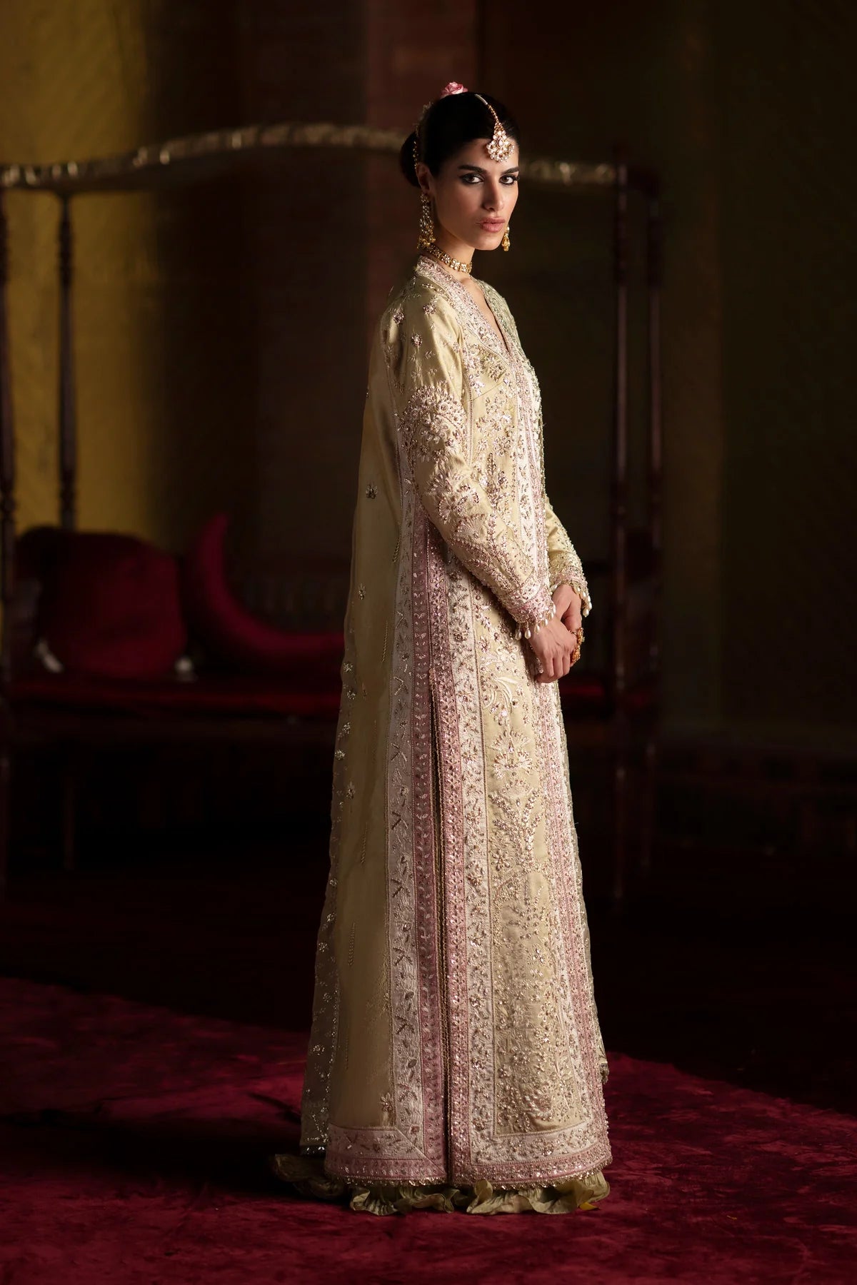 A stunning long pastel olive shirt on luxe tassel silk, adorned with delicate embroidery and intricate handwork. The design is elevated with elegant color-blocking side details, making it truly eye-catching. Paired with a beautifully embroidered dupatta and finely crafted handworked sharara pants, this ensemble blends grace with timeless artistry.
