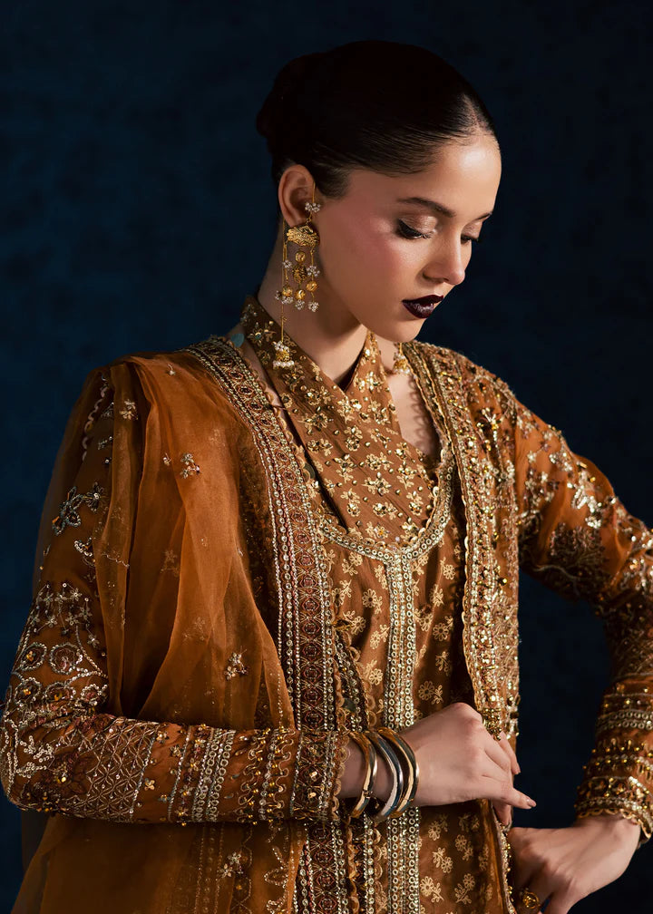 Zarmin from Lamhay Wedding Festive Volume II features a hand-embellished organza jacket, foil-printed raw silk sharara, and a delicately embroidered dupatta that completes this timeless festive look.